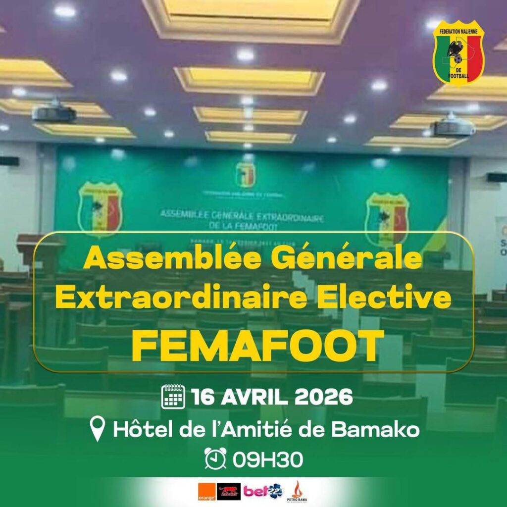 Le Secrétariat général de la Fédération Malienne de Football (FEMAFOOT), organise l’Assemblée Générale Extraordinaire Élective qui se tiendra ce jeudi 16 Avril à l’hôtel de l’Amitié à partir de 9H30.