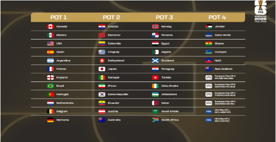 Les trois pays hôtes – Canada, États-Unis et Mexique – seront placés dans le chapeau 1. Les 39 équipes qualifiées restantes seront, quant à elles, réparties dans chacun des quatre chapeaux en fonction du Classement mondial masculin FIFA/Coca-Cola publié le mercredi 19 novembre 2025. Par ailleurs, les deux futurs vainqueurs du Tournoi de barrage de la FIFA et les quatre futurs vainqueurs des barrages européens seront d’office placés dans le chapeau 4.